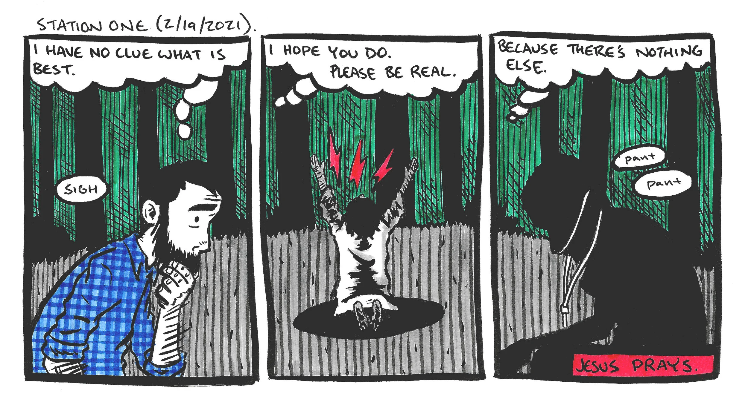 Lenten Comics day 3 February 20, 2021 / Joshua Dease Jesus was deeply grieved + agitated. Overcome by what is about to happen. Jesus prays. Comment 0 Likes categories / Lenten Comics tags / lentencomics