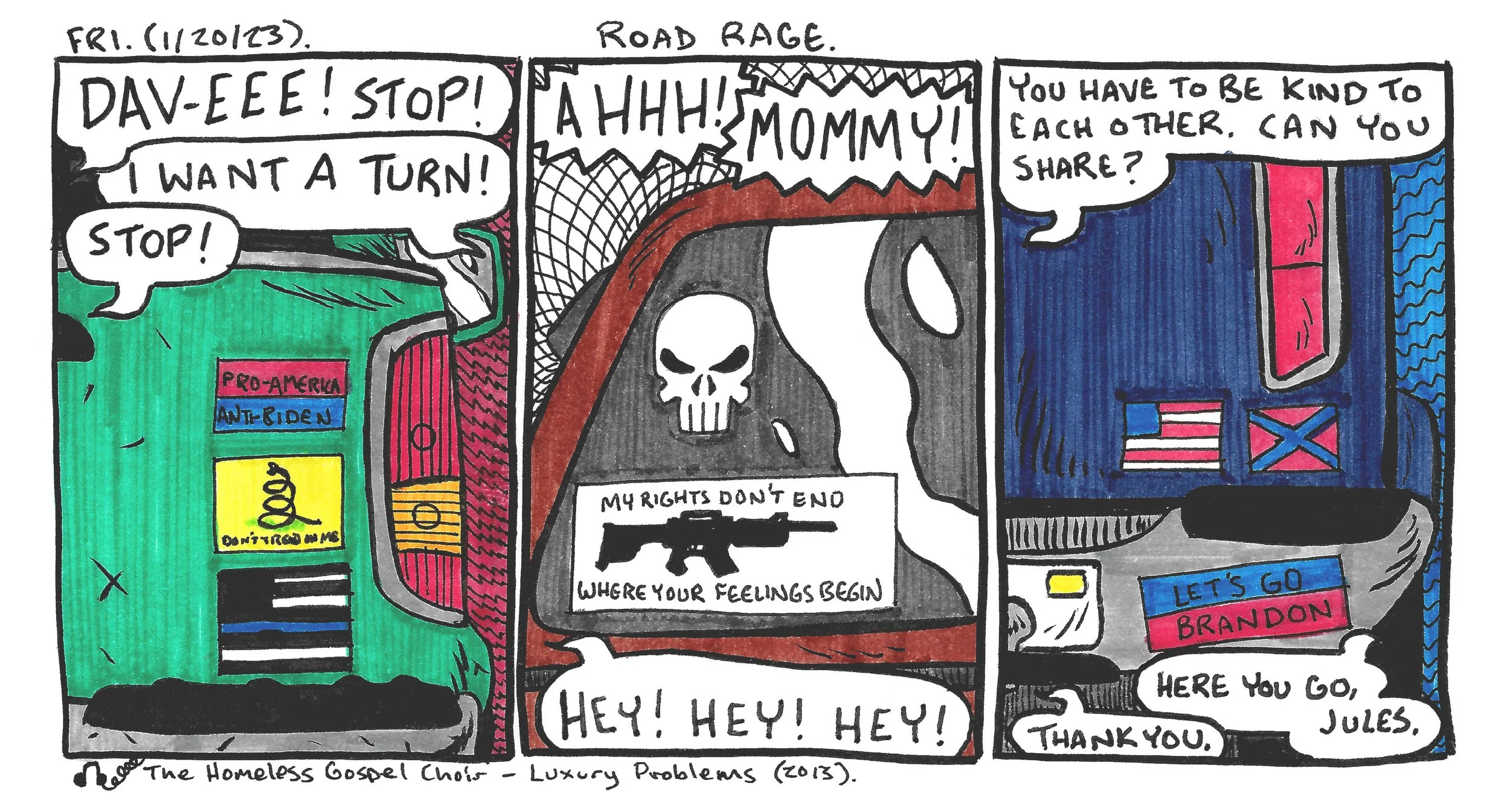 These vehicles driving around town remind me of the importance of raising my kids to be kind and contrary to the scarcity mindset that permits so much injustice and violence. As I made this it did occur to me that perhaps there is some benefit to people literally putting labels on all their fears and insecurities. They're almost like little trigger warnings: THIS PERSON CANNOT HANDLE CONFLICT WELL.