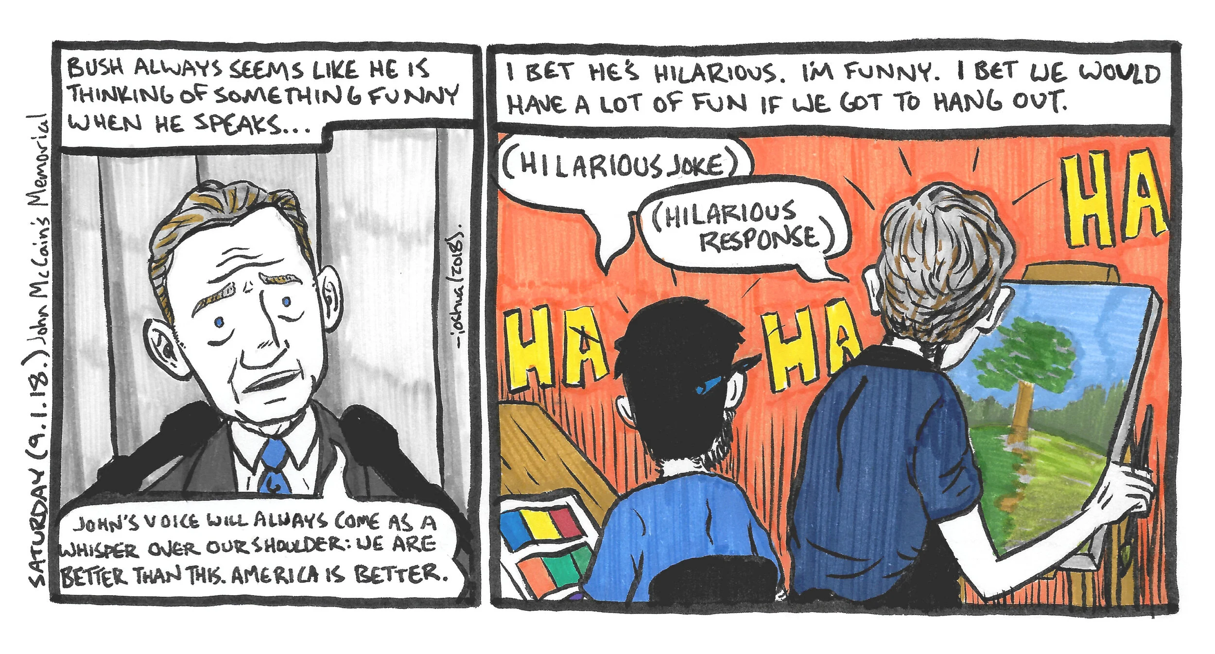 I drew this while streaming John McCain’s memorial service. I think presidents are always cooler after their time is up and they can move on (although that may not prove to be true for the current one-sorry to say).